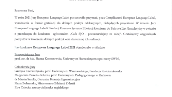 The Jury of European Language Label has awarded the Foreign Language Study project "Cafe SJO - let's talk with each other", besides the Ell certificates, a distinction in the form of congratulations for good educational practises, which are not projects. We would like to thank all teachers, students and trainees for co-creating it and actively participating in the meetings.