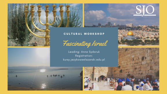 Co zwiedzić w Izraelu? Jakie fascynujące krajobrazy zobaczyć? A także co i gdzie zjeść? Na te pytania odpowie Anna Sydoruk podczas warsztatów kulturowych „Fascynujący Izrael”. Na uczestników spotkania będzie czekał pokaz zdjęć, solidna porcja informacji i barwnych anegdotek, a także drobny poczęstunek, stanowiący zachętę do samodzielnego odkrywania tej pachnącej egzotyką kuchni.