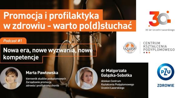 <strong>„Promocja i profilaktyka w zdrowiu – warto po(d)słuchać”</strong> to cykl podcastów dedykowanych nowoczesnej profilaktyce chorób i promocji zdrowia, czyli dwóm bohaterkom nowatorskiego kierunku studiów podyplomowych Zarządzanie Promocją Zdrowia i Profilaktyką Chorób realizowanych w Centrum Kształcenia Podyplomowego Uczelni Łazarskiego, którego partnerem merytorycznym jest <strong>PZU Zdrowie</strong>. Kierownikiem studiów i gospodynią podcastów jest Marta Pawłowska.